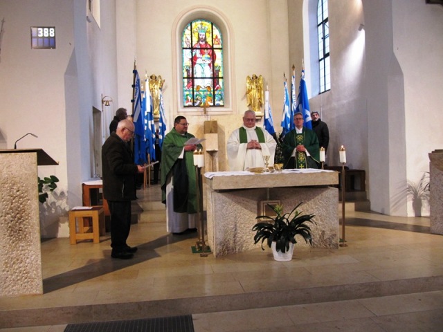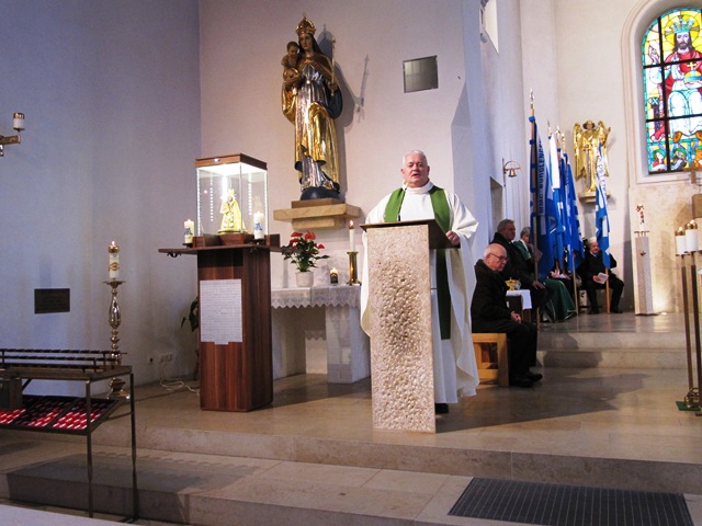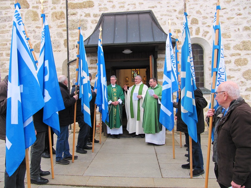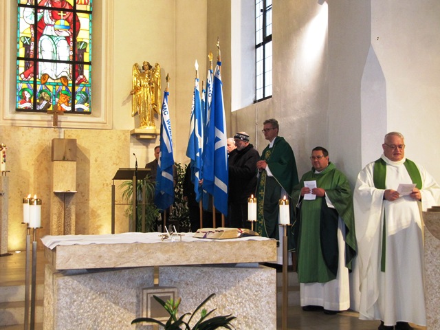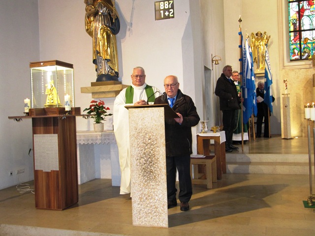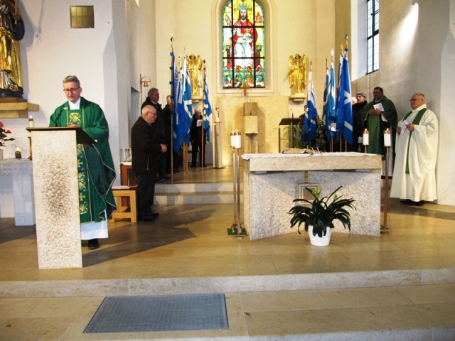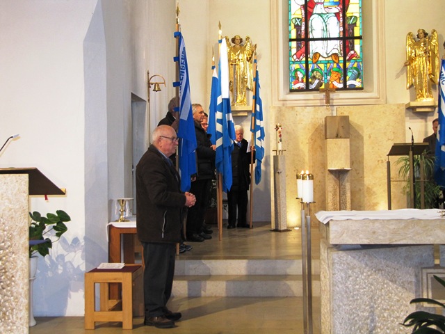 Der Festgottesdienst für die verstorbenen Sodalen wurde zelebriert vom Zentralpräses Monsignore BGR Thomas Schmid zusammen mit Bezirks- und Pfarrpräses Pfarrer Josef Hausner und Pfarrpräses Nobert Pabst. Die musikalische Umrahmung zum Gesang an der Orgel spielte Oscar Schwarz, die Lesung trug Präfekt Peter Krikorka vor. Die Fürbitten und die Totenehrung trug Bezirksobmann Johann Faltermeier vor und war als Messdiener tätig. Während des Liedes „Maria, breit den Mantel aus“ zogen die Bannerabordnungen und der Altardienst aus. Vor der Kirche wurde dann Spalier gestanden.