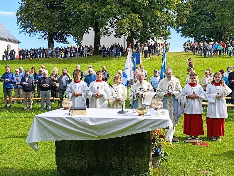 Der Festgottesdienst um 10.30 Uhr wurde – wie in den Vorjahren – bei schönem Wetter am Freialtar gefeiert. Unter den Klängen der Trachtenkapelle Waldthurn zogen die Fahnenabordnungen verschiedener Marianischen Männer-Congregationen (MMC) aus der näheren und weiteren Region feierlich ein.