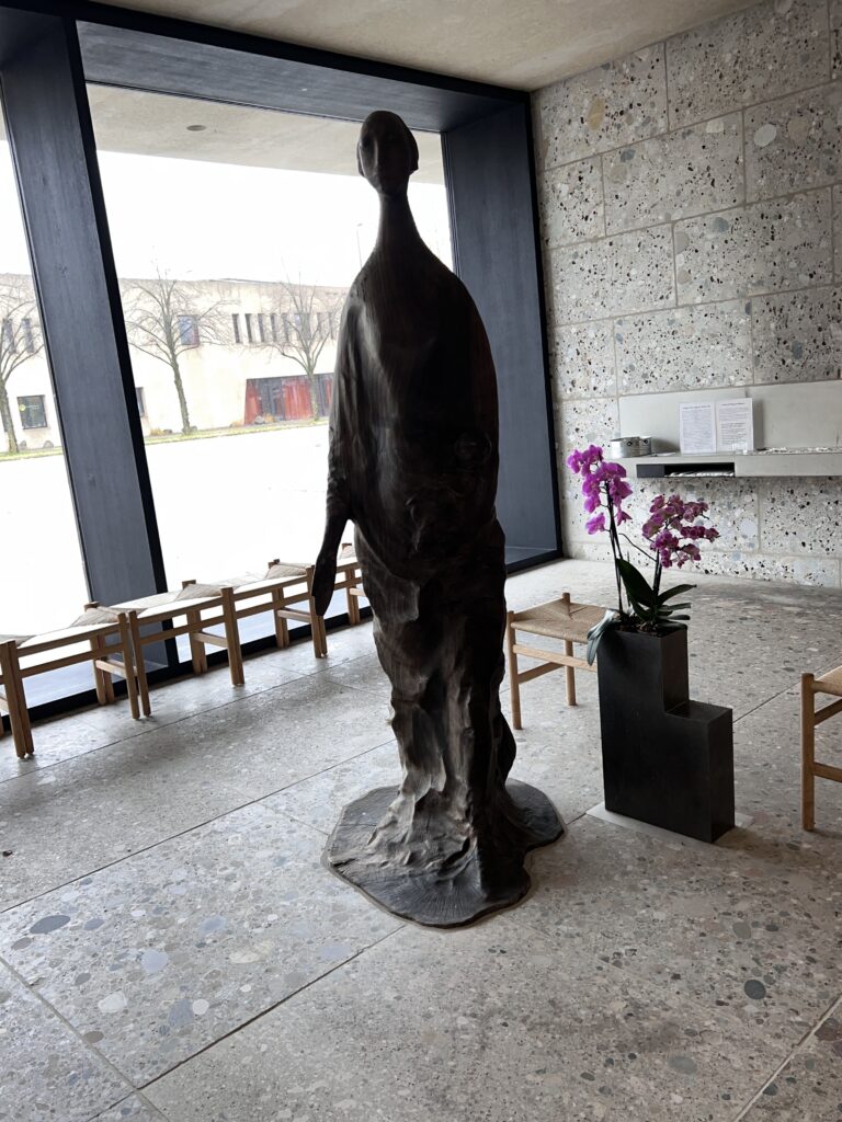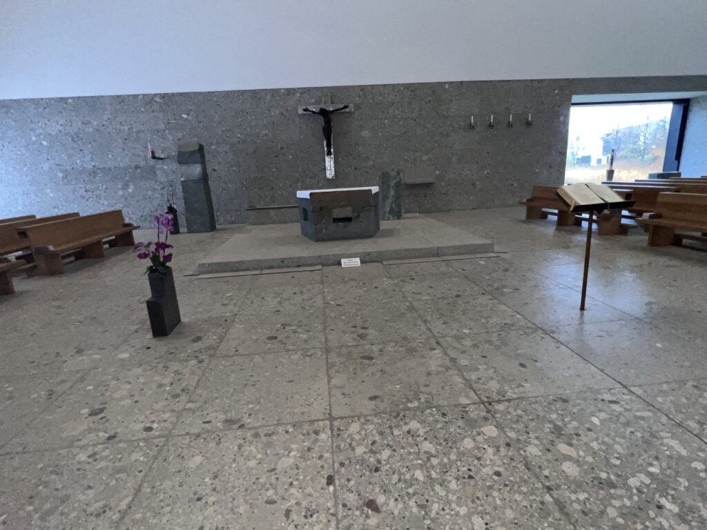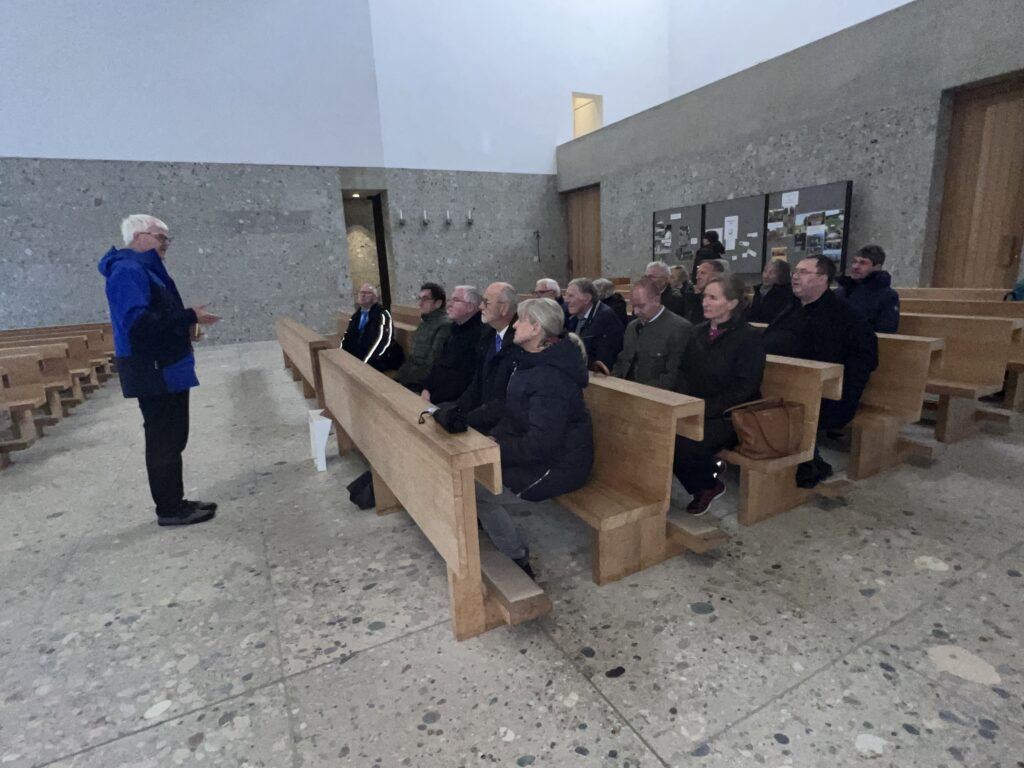 Nach diesem eindrucksvollen Besuch in der Bürgersaalkirche fuhr der Bus des Reiseunternehmens Dechant die Teilnehmer nach Poing zur Besichtigung der neu gebauten Kirche Seliger Pater Rupert Mayer. Der Vorsitzende des Fördervereins Franz Hohl erläuterte ausführlich die Baugeschichte und die Architektur des Neubaus und den Bezug zum sel. Pater Rupert Mayer.