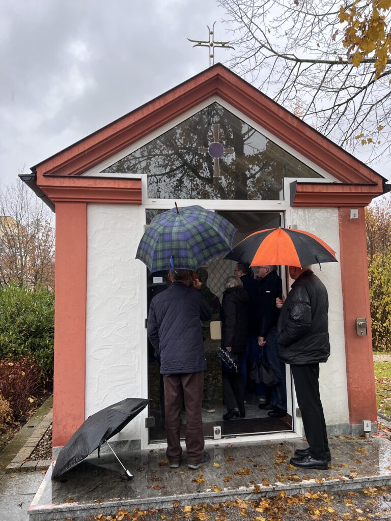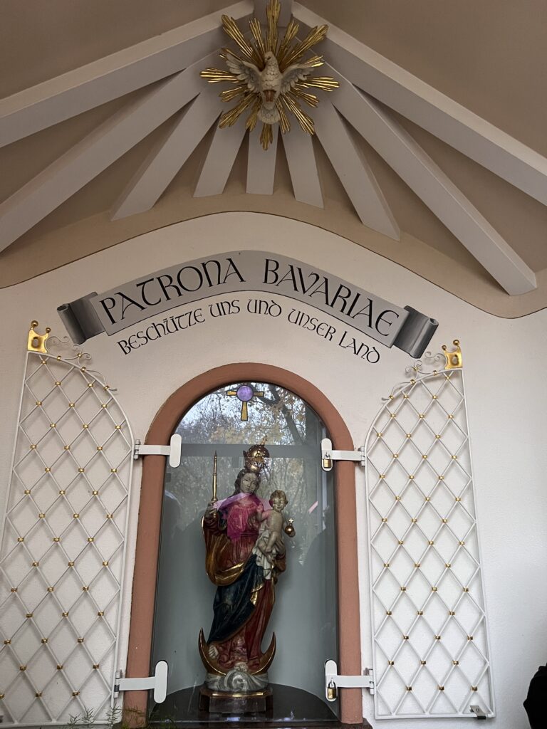 Der Obmann der MMC Poing, Emmeram Lang führte dann die Gruppe zur Bergfeldkapelle Patrona Bavariae in einer nahegelegenen Parkanlage. Diese Kapelle mitten in einem Wohngebiet wurde in Eigenleistung von Mitgliedern der MMC Poing errichtet.